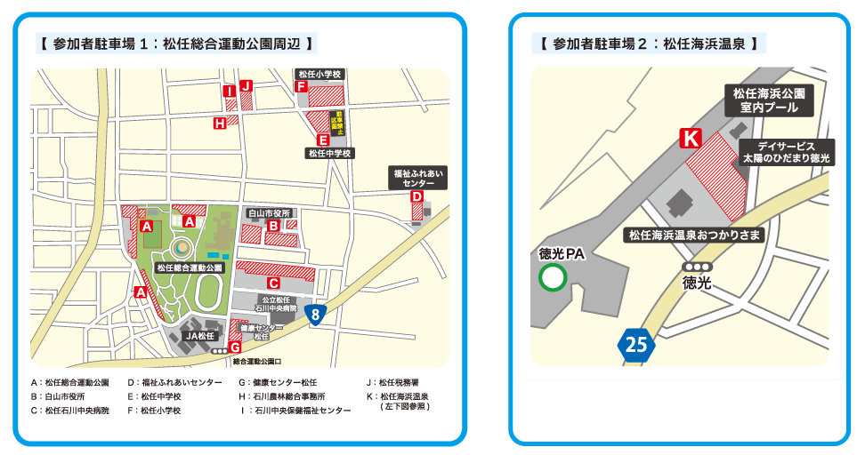 | E | 松任中学校グラウンド(白山市末広2丁目1) | 210台 | 徒歩 約15分 |